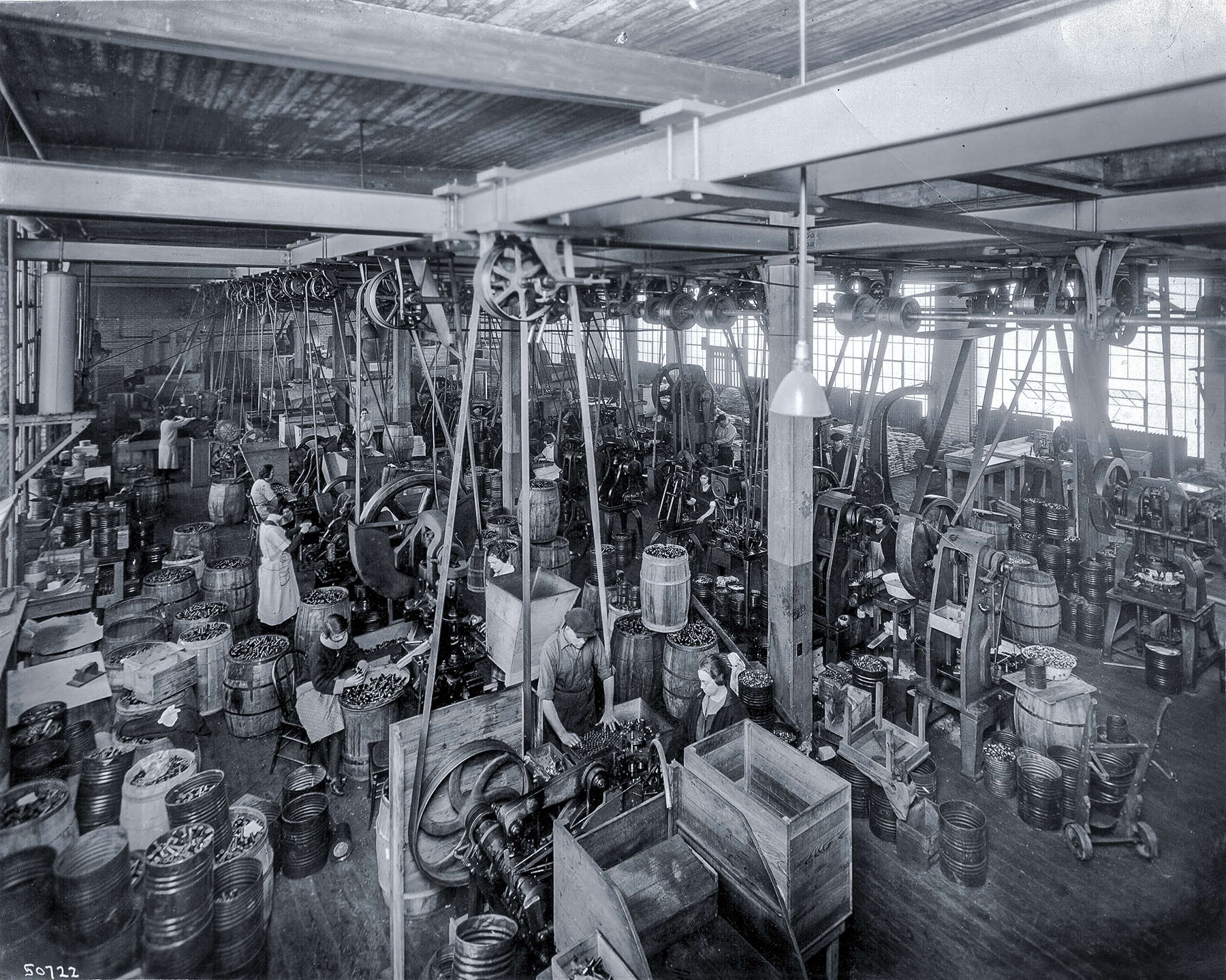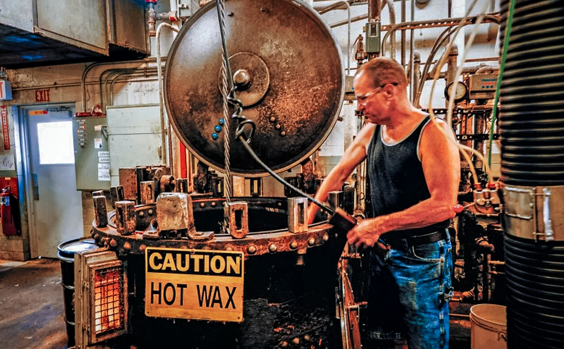From there, the paper tubes are placed into a huge kettle full of melted wax so that the paper can be impregnated with it and become water resistant. The excess wax drains into a huge basket where it is collected to be used over and over again. This process isn’t mechanized and is hot work for the person manning the kettle full of liquid wax.