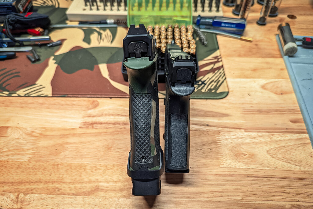 The grip sports a singular finger groove for easy indexing without forcing your fingers into specific grooves: a plus for people whose hands don’t fit into regular molded finger grooves. Second, there’s a nice palm swell angle to the rear of the grip that effortlessly forces your hand to ride higher on the grip, thereby giving you a better hold and recoil control.