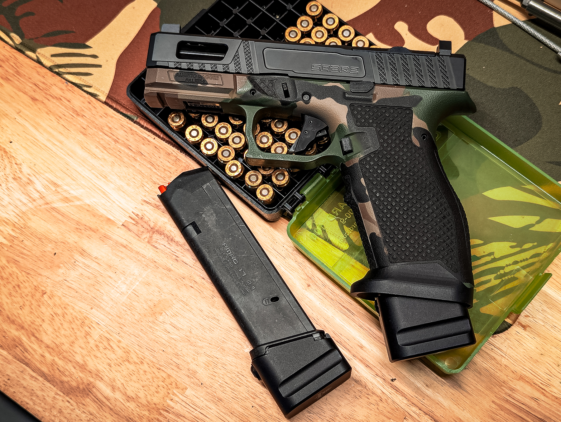 Magazine: Accepts Glock 17 magazines – comes with 2 17-round Magpul magazines with +5 round Sabre extensions