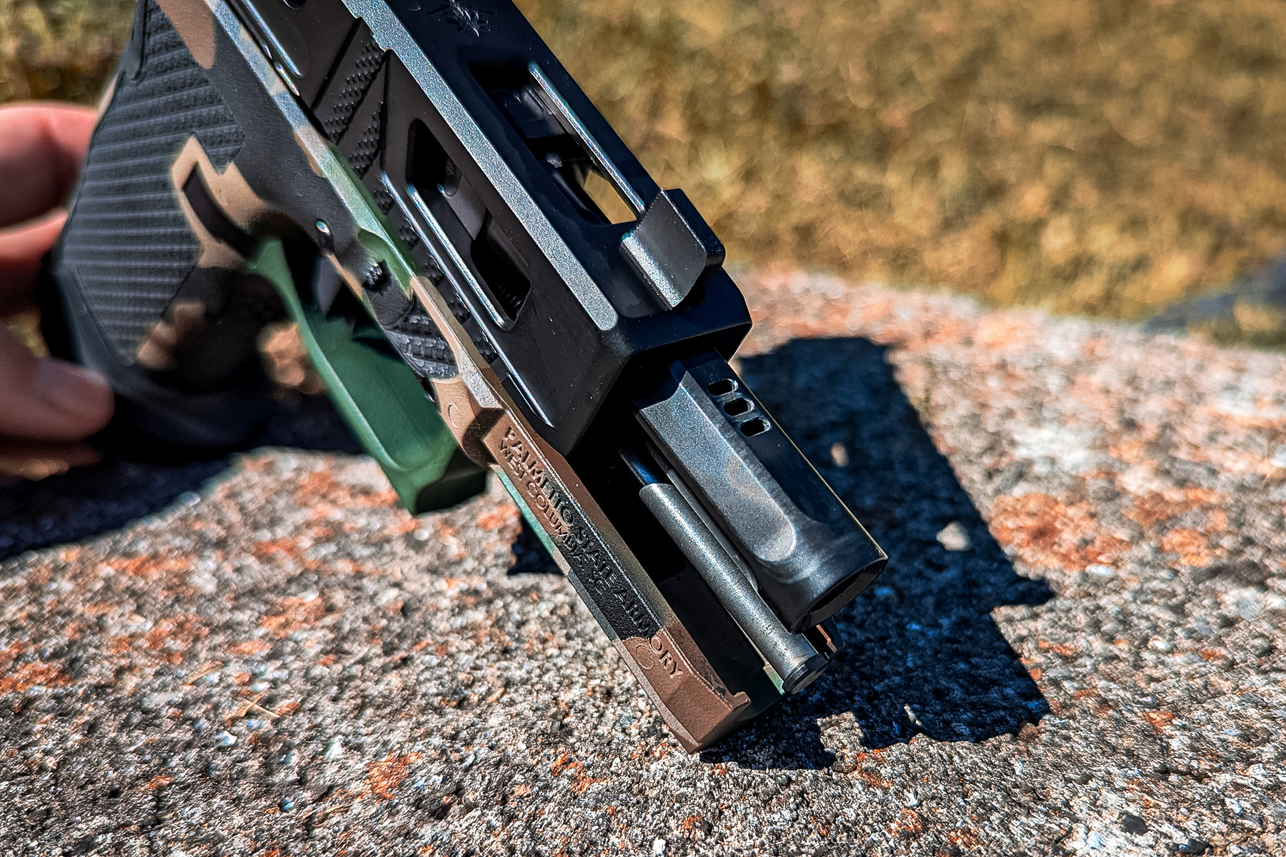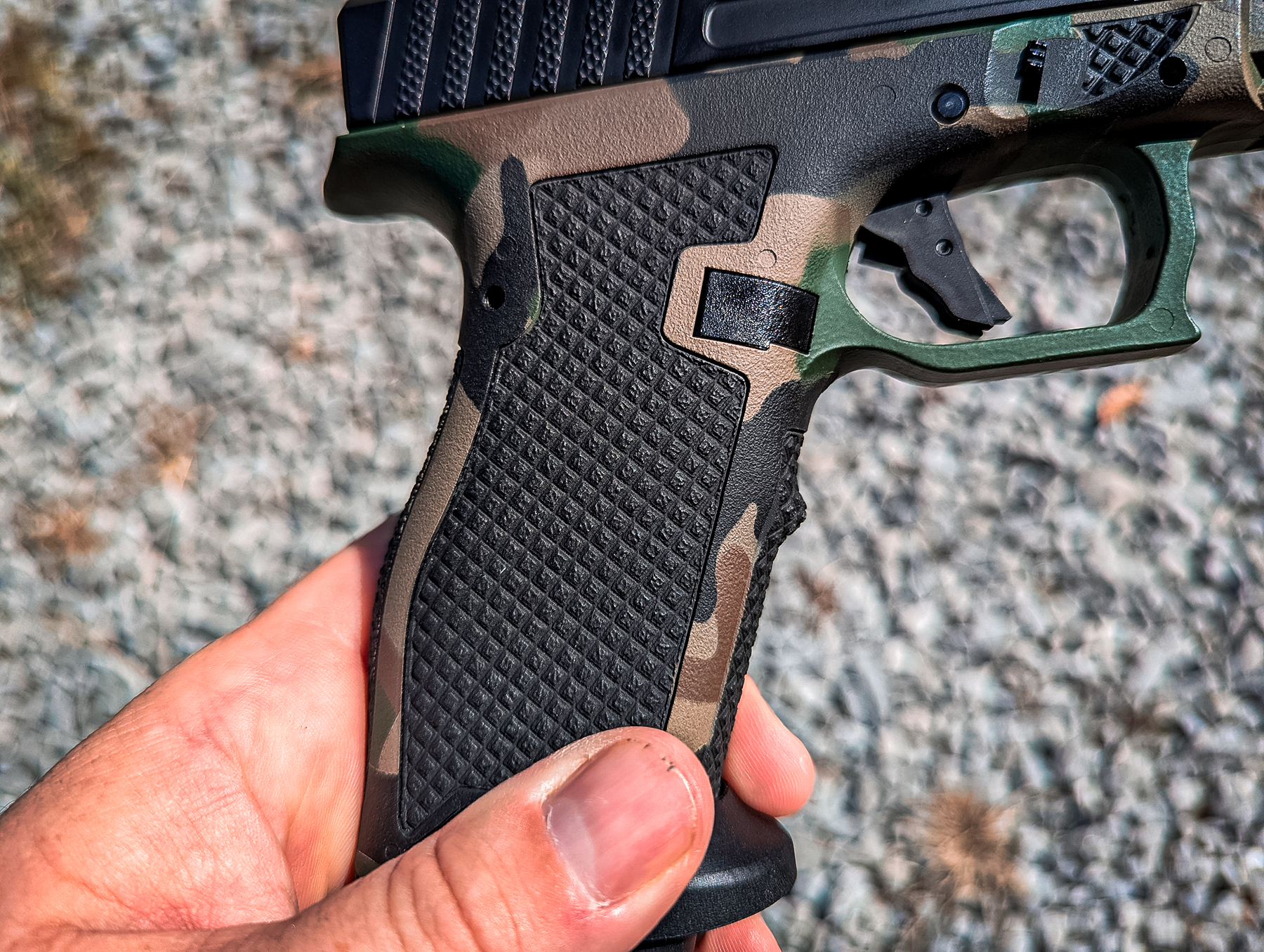 Handguns absolutely must perform at all costs, but they can look great, too. Before we get into the performance side of things, let’s take a minute to appreciate the aesthetics of this gun. With a stippled frame that’s sporting a black magwell and black slide, the M81 Woodland Cerakote camo finish on the frame makes the gun stand out in a crowd and complements the black parts on the top and bottom of the gun with a little throwback flavor.