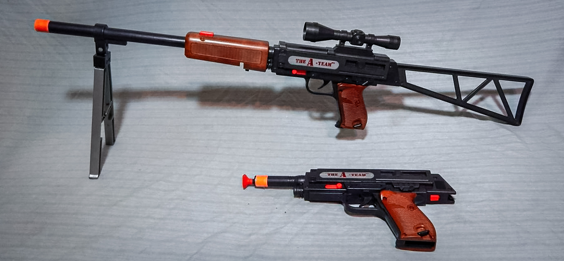As the 1980s wore on, the A-Team branding was ditched and the same toy gun was released as a Rambo-branded product, but it was entirely the same. They even made a version for the landmark mini-series V (1983).