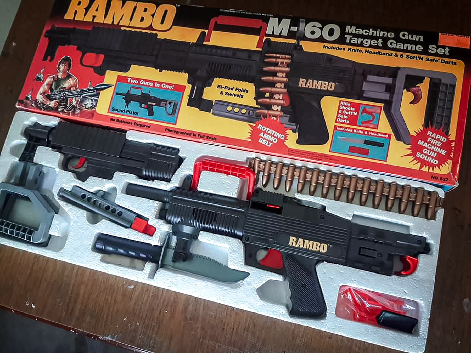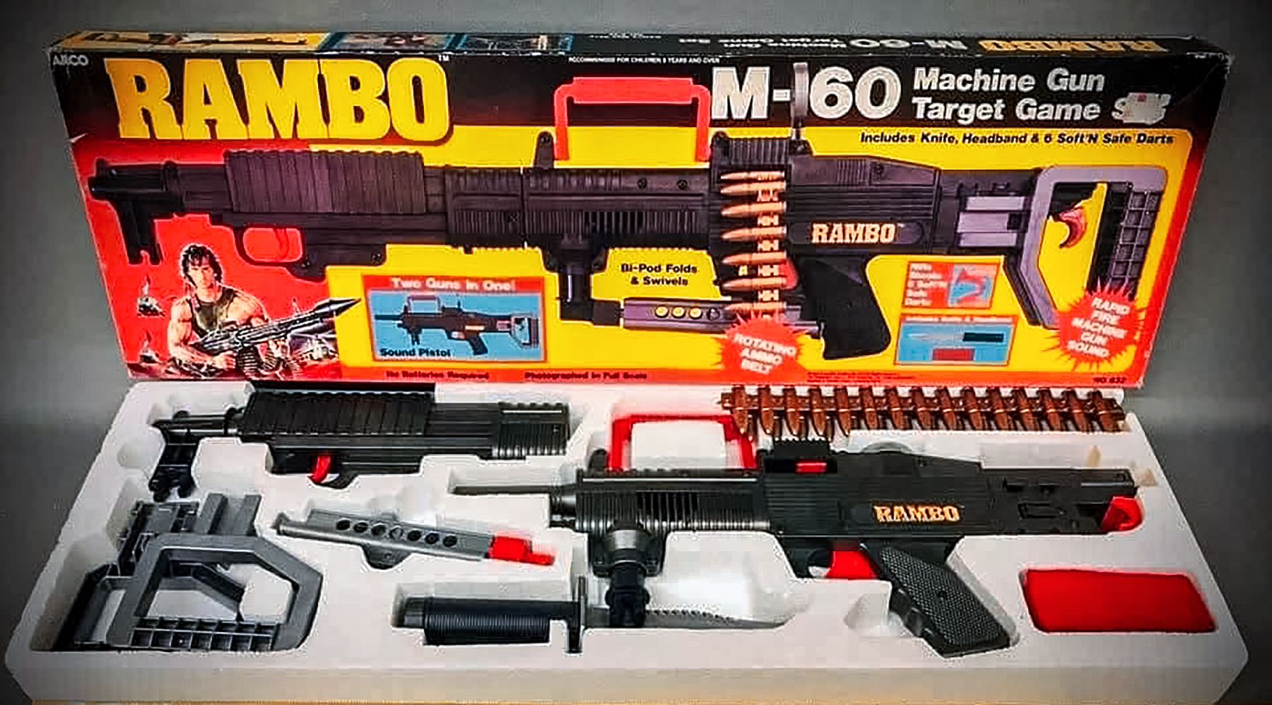Not only that, but it came with a detachable bipod, and the main gun had two triggers at the rear, detachable handles, and a flip-up crosshair sight, so you could shoot it like a mounted machine gun. Of course, a plastic Rambo knife and a little red headband were also included.