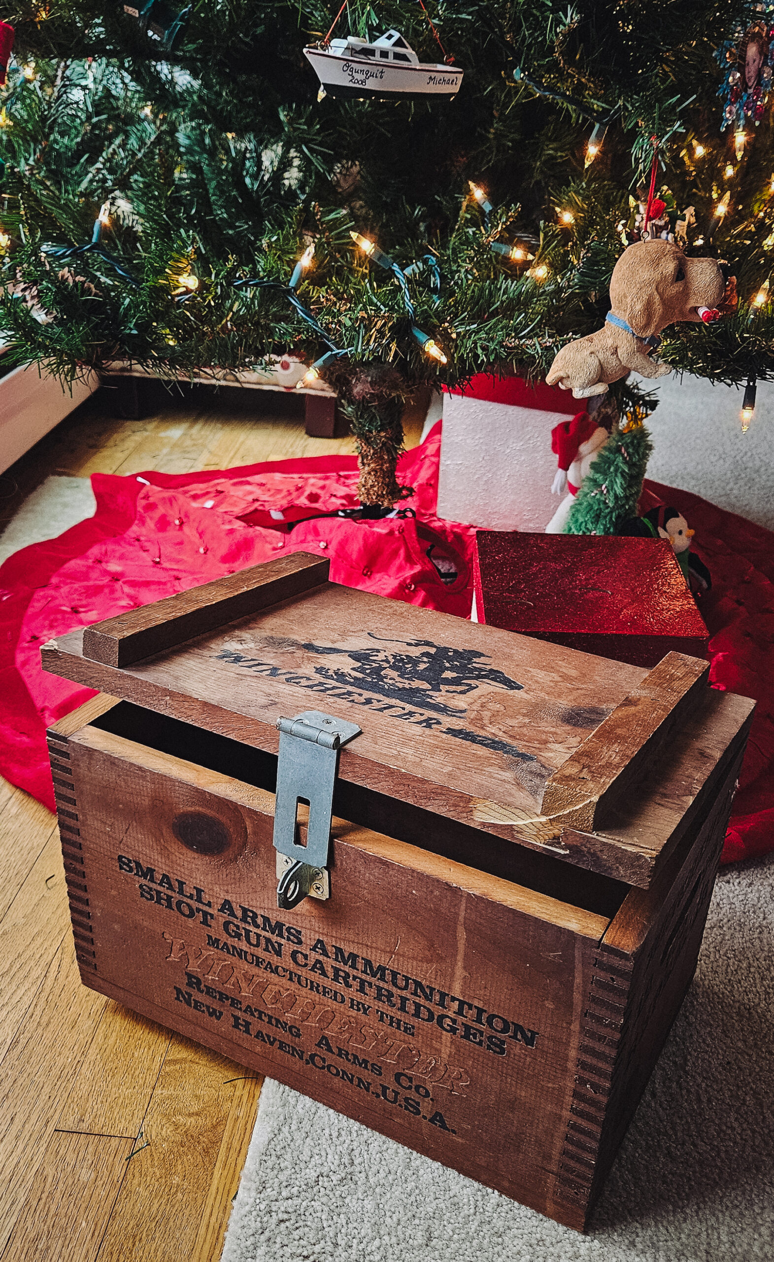 The author’s vintage and battle-scarred Winchester Ammunition box has clearly been through the wars. And here it sits under the Christmas tree in 2025.