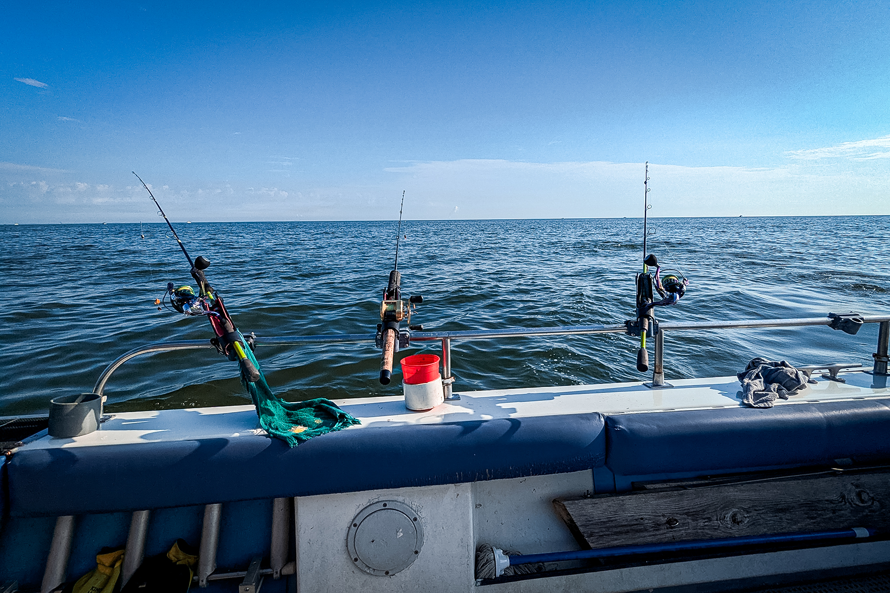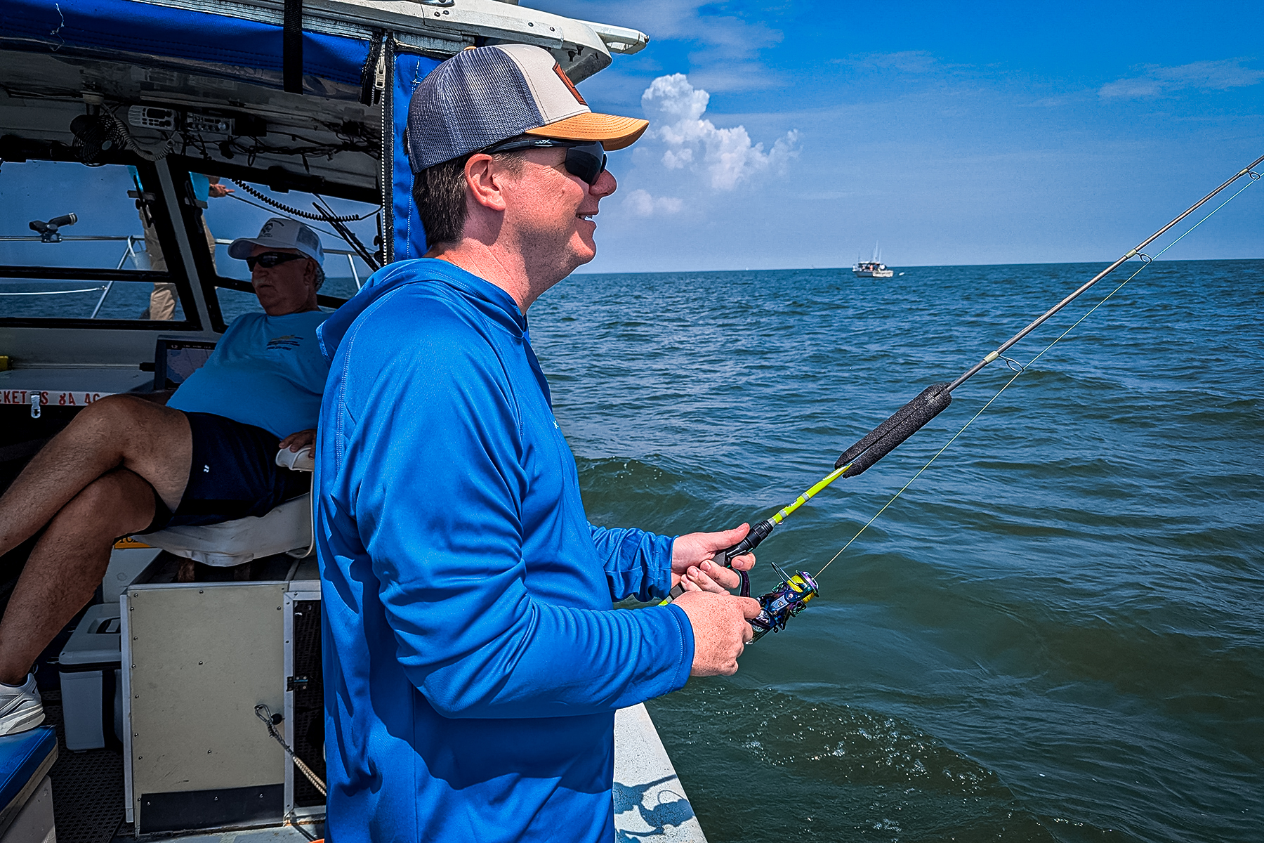 Capt. McGee got me all set up with a rod and spinning reel off the rear starboard side of the boat. As a complete newbie, I had a lot to learn, and fast. First, I learned that you want 6 to 8 inches of line below the sinker at the tip of the rod before attempting to cast so the weight and momentum of the line, sinker, and bait get you some good distance.