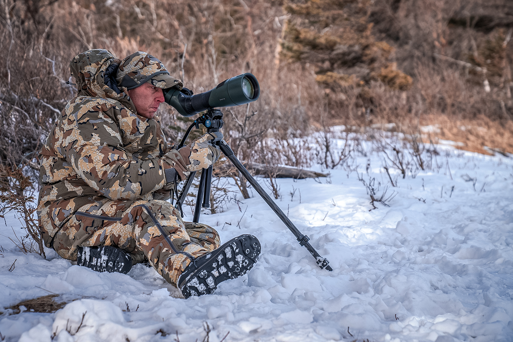 In truly frigid conditions below 32, however, things get more intricate. For the top, cold-weather hunters might start with an ULTRA Merino 145 Zip-T base layer, a StrongFleece 290 or Kenai Jacket mid layer, and an insulated KUIU Kutana Gale Force hooded jacket up top. Something to consider: KUIU’s Super Down Haven jacket (below 32 degrees) is way warmer than Gale Force and built for stationary stand hunting.