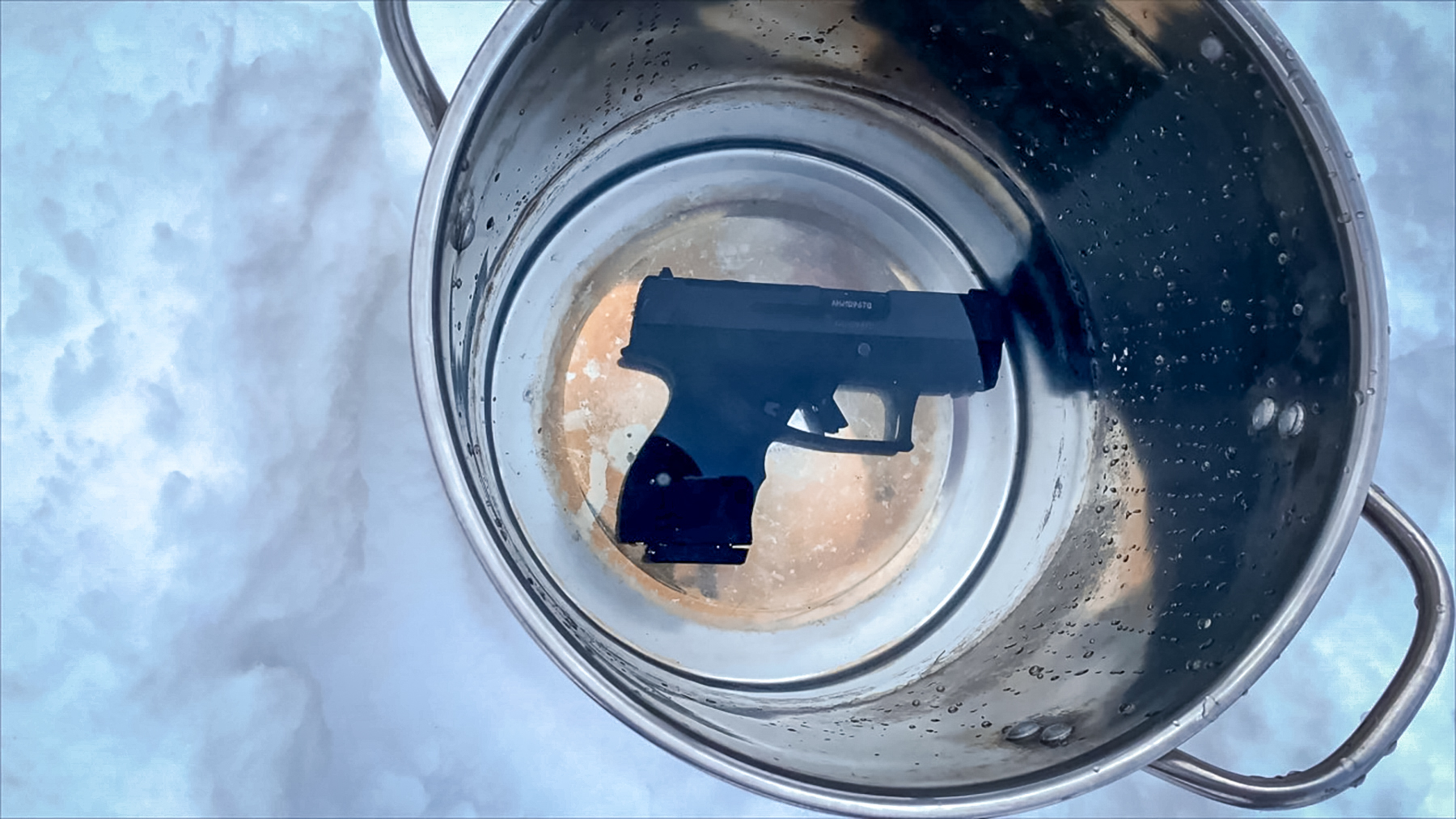 Meanwhile, I’d brought along a tall stainless container holding five inches of cold water. I set the pot next to my shooting table and submerged the sub-compact loaded with 10 rounds.